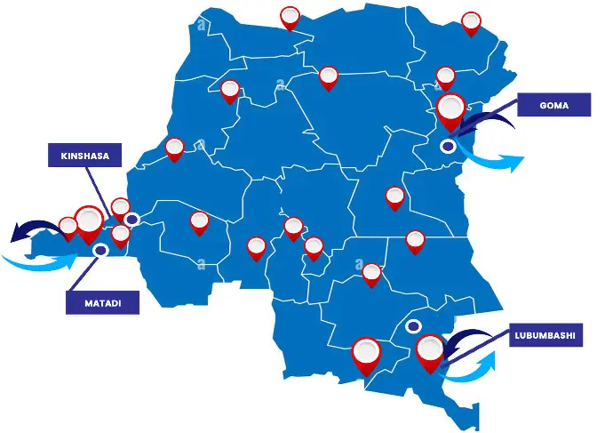 Grâce à ses partenaires en RDC, SDE opère principalement sur l’axe Kinshasa-Matadi-Boma-Tshela mais est capable de répondre à des demandes spécifiques.